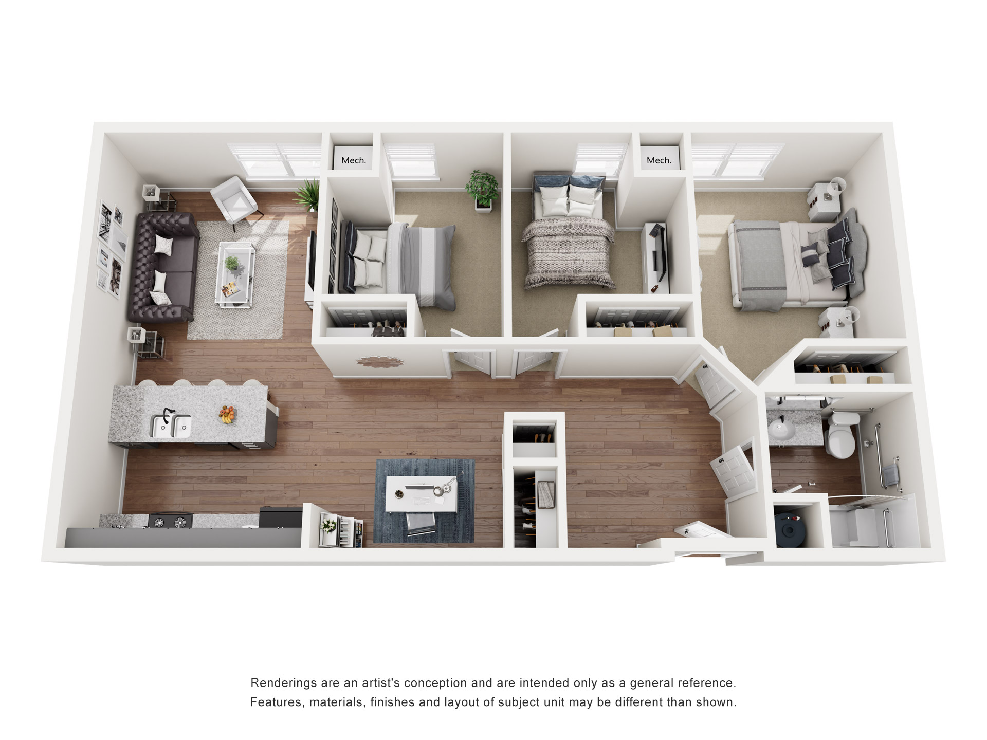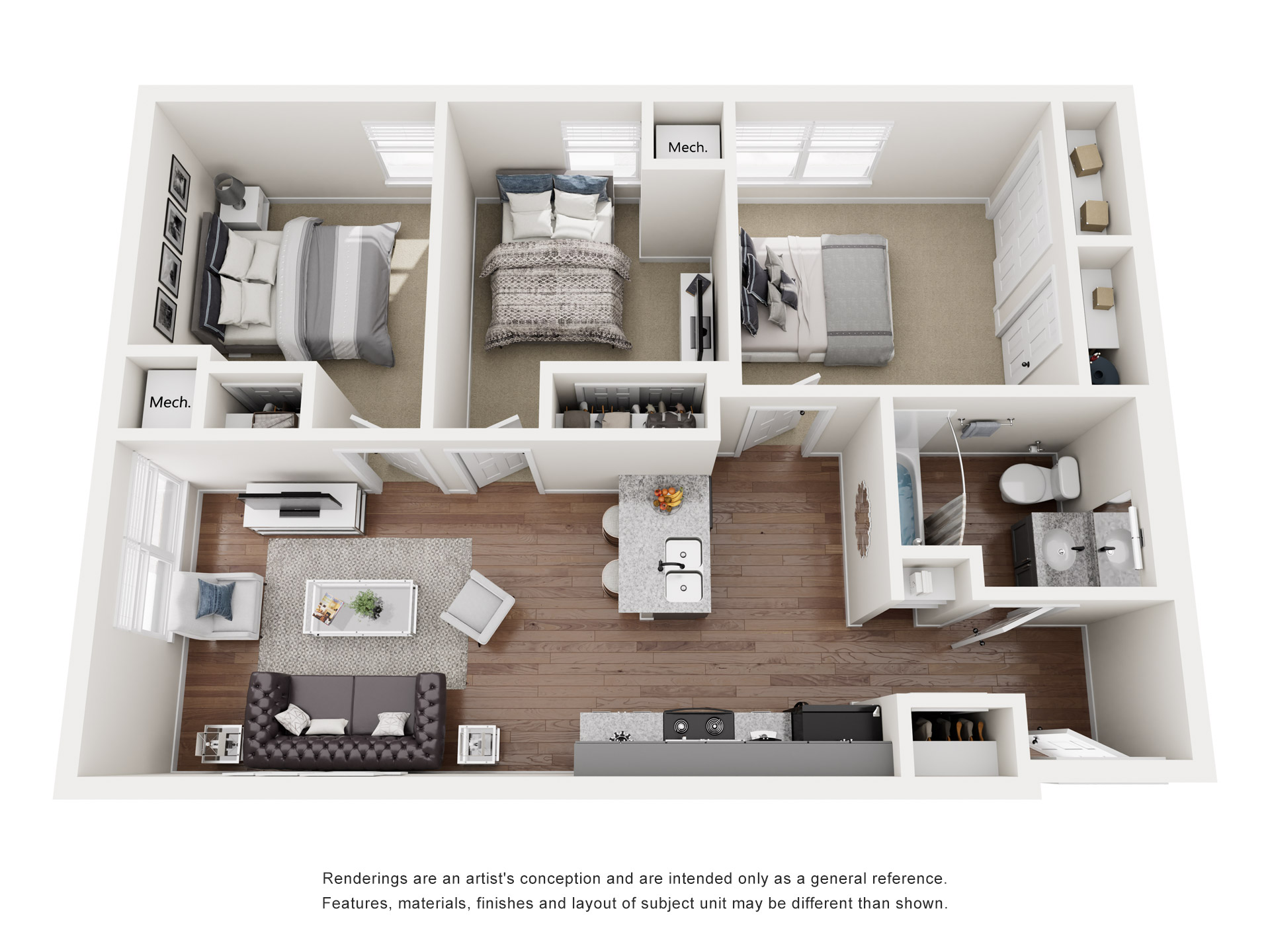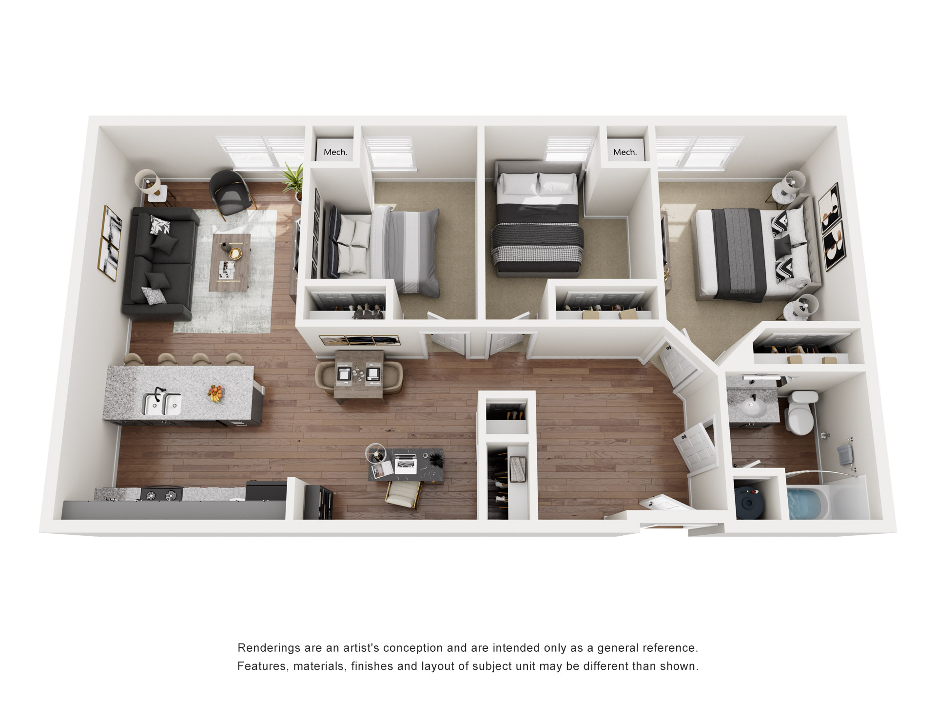 Our brand-new one, two, and three-bedroom apartment homes feature modern, fully equipped kitchens with sleek black, white, and stainless steel finishes. Each unit boasts spacious bedrooms, ample storage, and thoughtful layouts designed for comfortable living.
